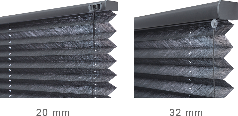 Plissé gordijnen bestaan uit één laag stof met een subtiele horizontale plooi van 20 mm voor een verfijnde uitstraling of een robuuste plooi van 32 mm. Vooral voor grote raampartijen geeft de plooibreedte van 32 mm een opvallende uitstraling.