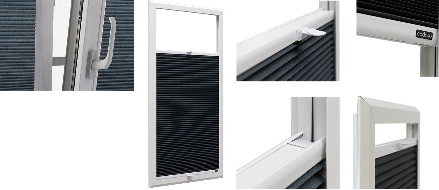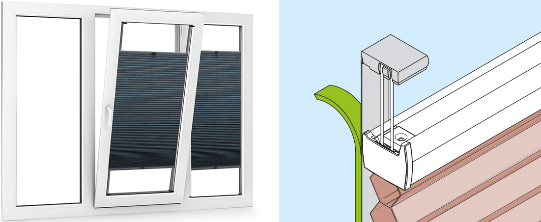 is een profiel met plakstrip dat rechtstreeks op het glas kleeft. Het raam kan maximaal geopend worden en in kiepstand blijft het Plissé gordijn strak tegen het glas zitten.