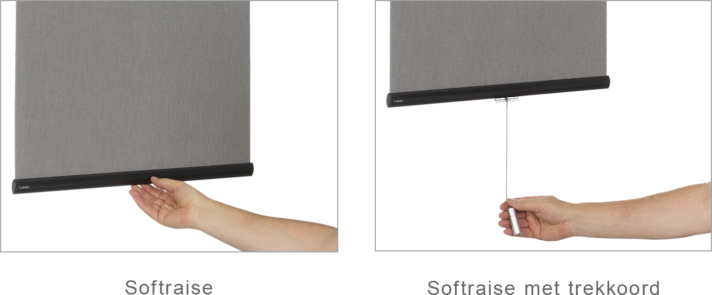 Met deze bediening kunt u met gemak het rolgordijn manipuleren door de onderlat naar de gewenste plek te verplaatsen. Op die manier zal het rolgordijn automatisch vast blijven in de gewenste positie. Met een korte trek aan de onderlat zal het rolgordijn automatisch omhoog rollen naar de vooraf ingestelde bovenpositie. Als u kiest voor de Softraise optie zorgt dit voor een rolgordijn met een strakke en naadloze uitstraling.